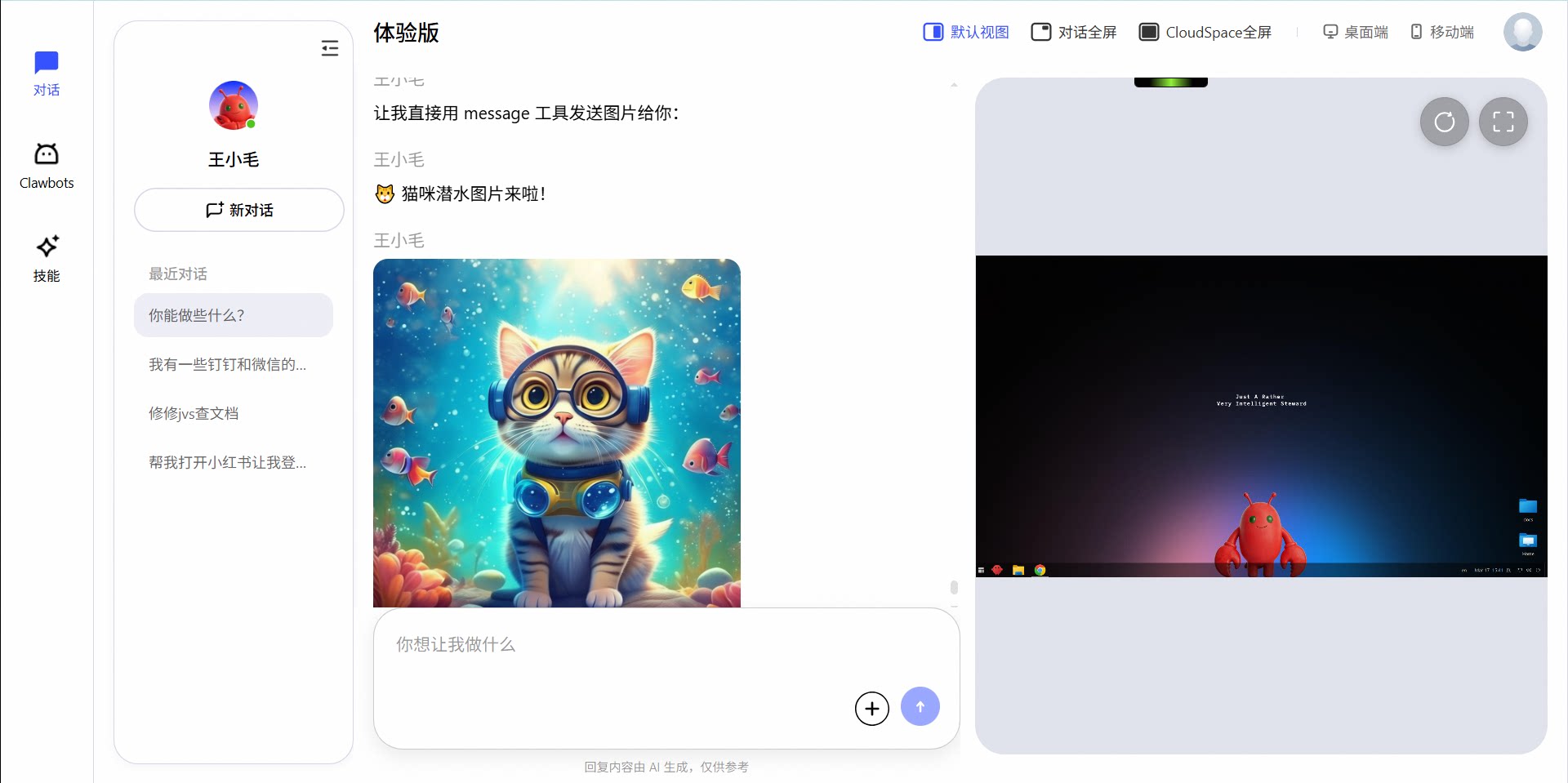 | 🗺️prompt与展示效果 | 提示词示例: 帮我生成一个调用大模型api,生成图片的功能,生成一张猫咪潜水的图片,我的百炼apikey是:** ![]() |