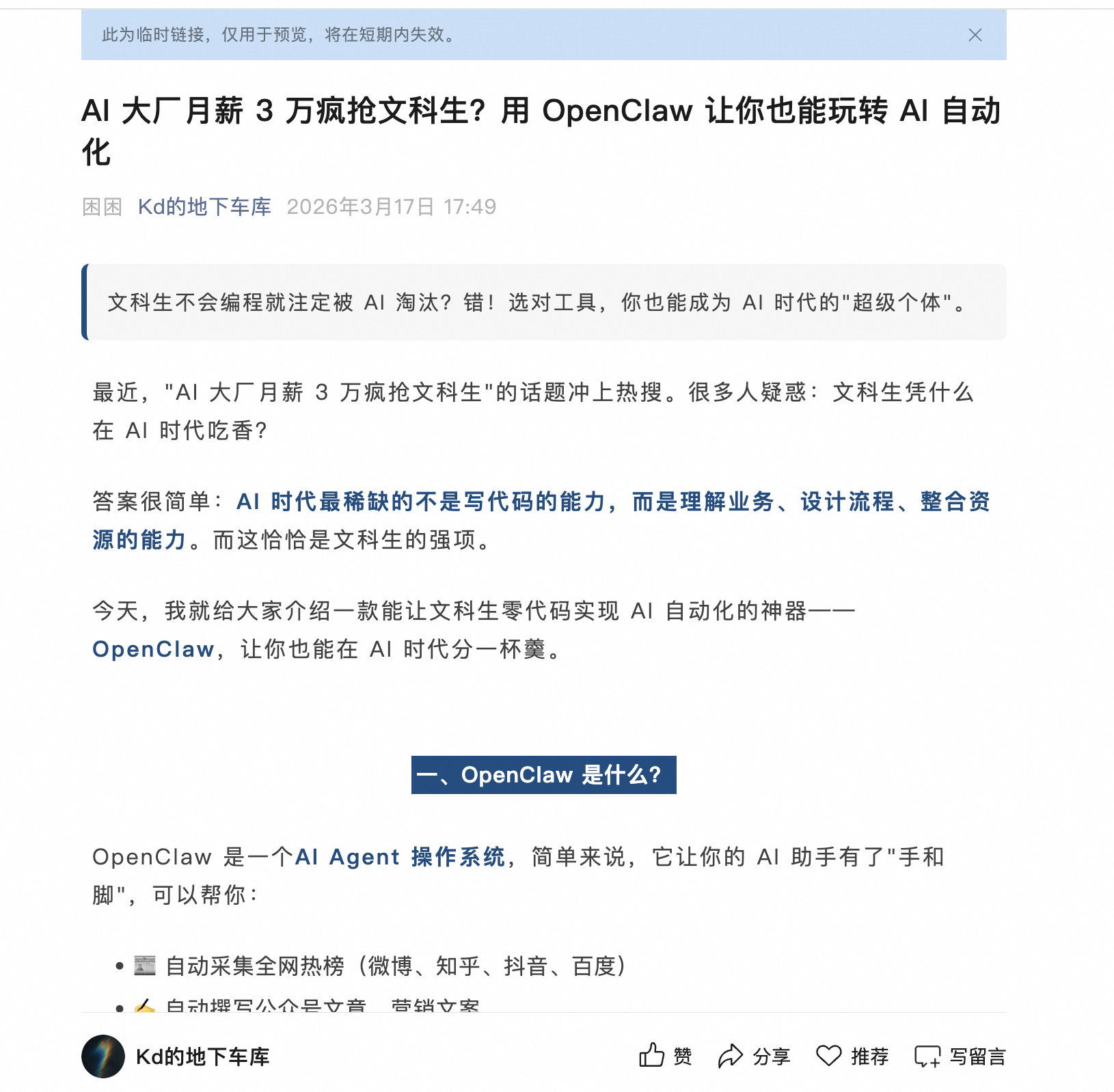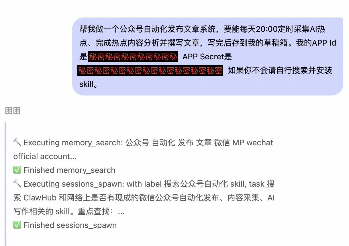 | 🗺️prompt与展示效果 | 提示词示例: 帮我做一个公众号自动化发布文章系统,要能每天20:00定时采集AI热点、完成热点内容分析并撰写文章,写完后存到我的草稿箱。我的APP Id与APP Secret是*。如果你不会请自行搜索并安装skill