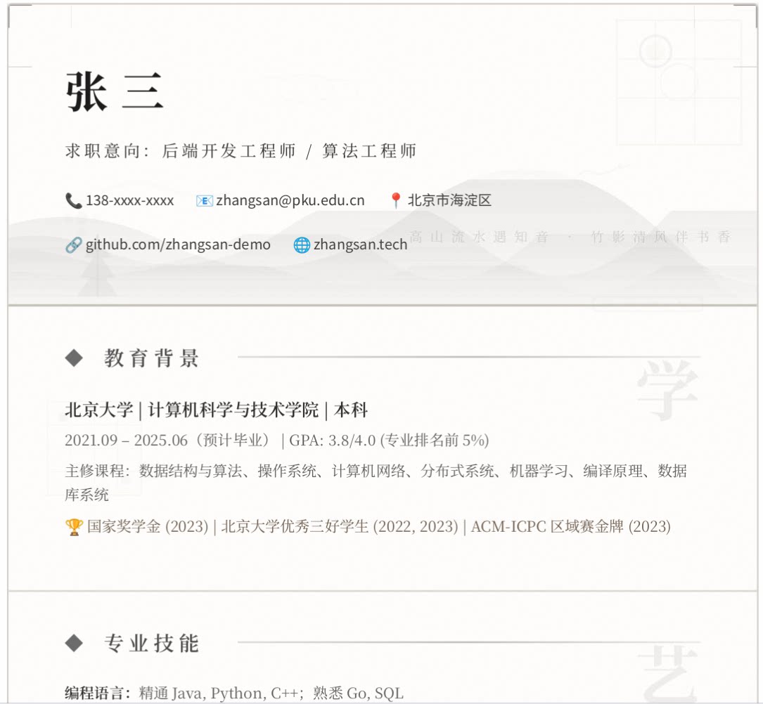 ![]() 步骤二: 按照喜欢的风格继续调整简历。 提示词示例: 做得很好,这就是我要的内容了。请继续使用刚才内容,再给我生成一个具有中国风的简历,配色和中国风的元素都需要更加美观地体现。