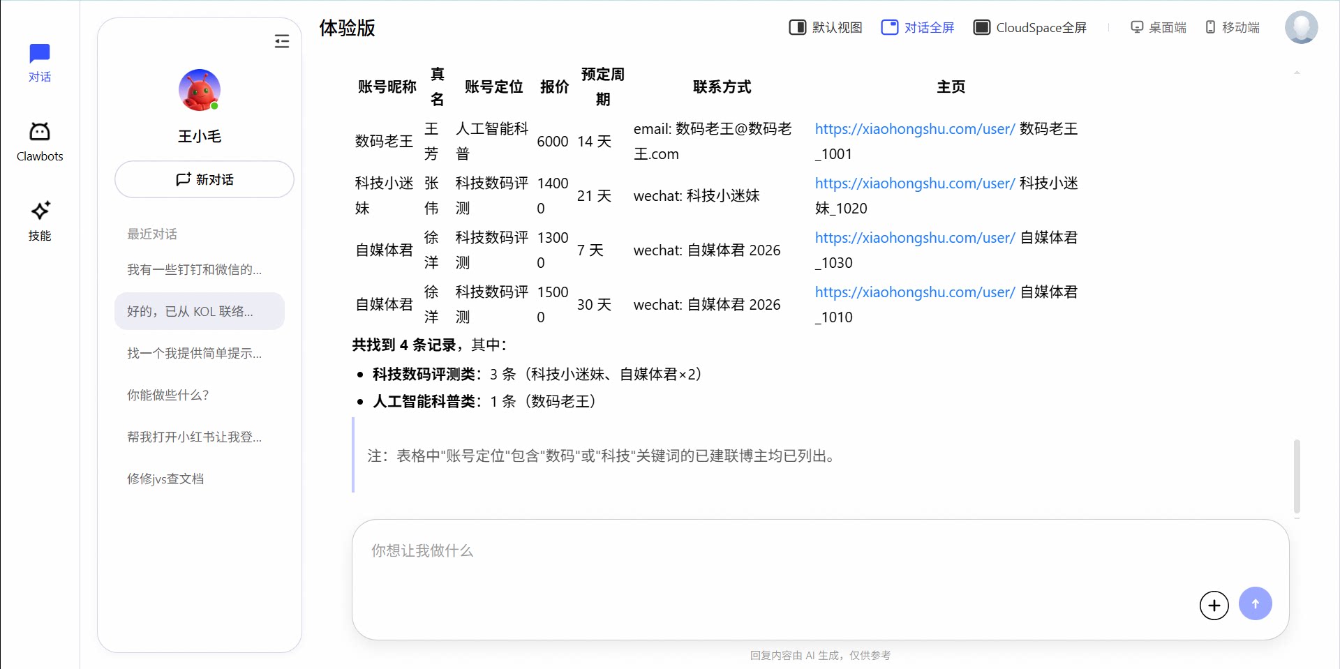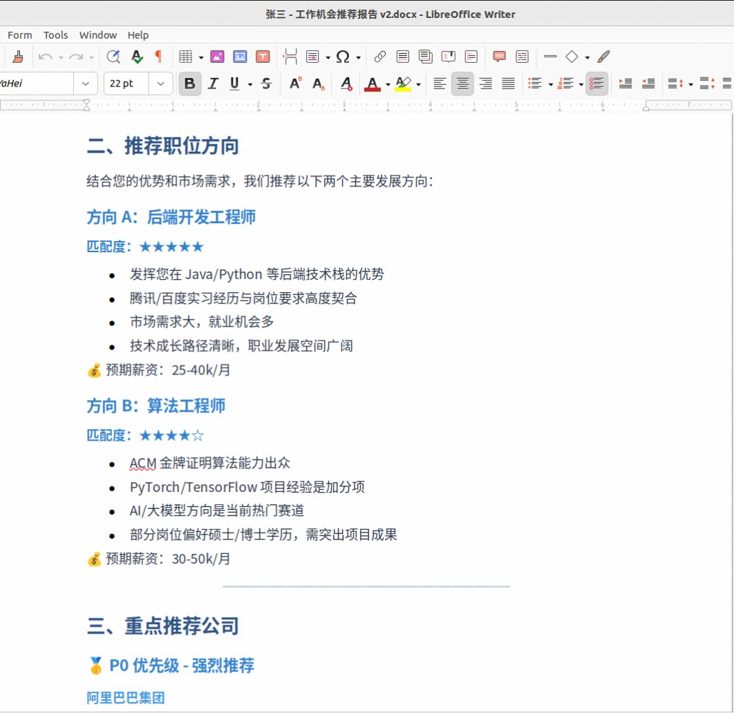 步骤三:帮我在线求职,生成工作报告提示词示例: 基于前面做好的我的简历(桌面文档-个人简历),帮我在求职信息网站匹配相关工作信息,并生成工作推荐报告(word文档) ![]() |