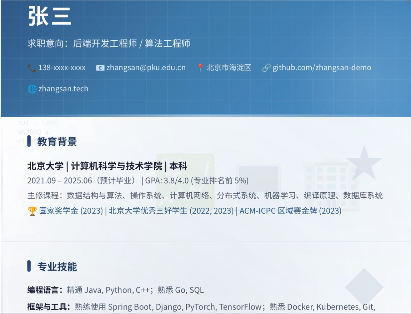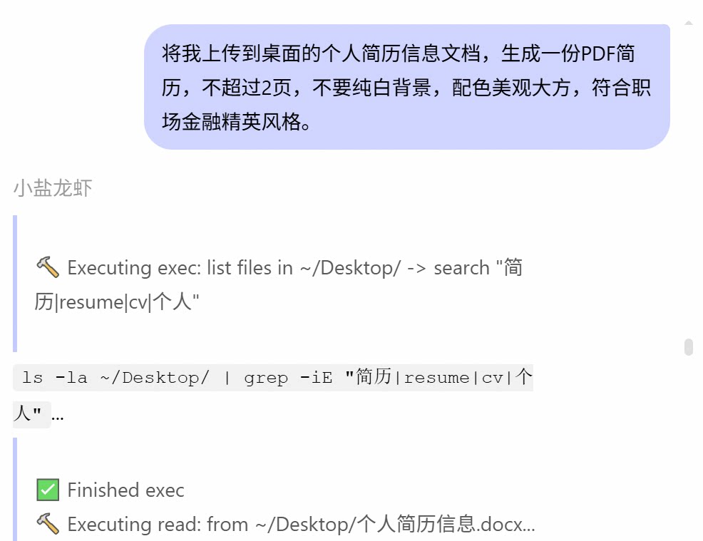 | 🗺️prompt与展示效果 | 步骤一:上传人物信息,生成PDF简历。 提示词示例: 基于我上传到桌面AI文档中的个人简历信息,生成一份PDF简历,不超过3页,采用金融职场精英风格。