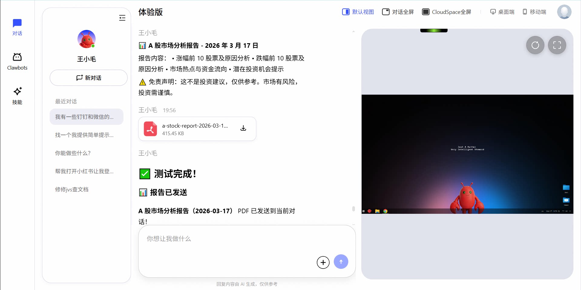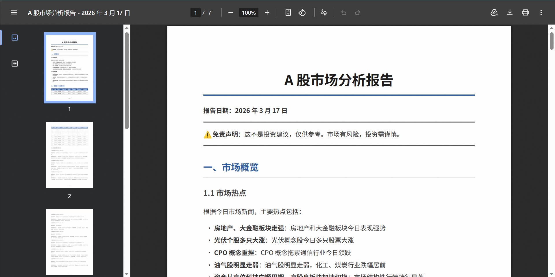 | 🗺️prompt与展示效果 | 提示词示例: 每天17:00收集A股涨跌幅前20的股票相关的资讯,并分析为什么会涨或跌,潜在的机会是什么,生成pdf报告发给我