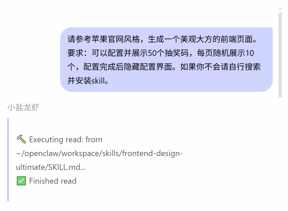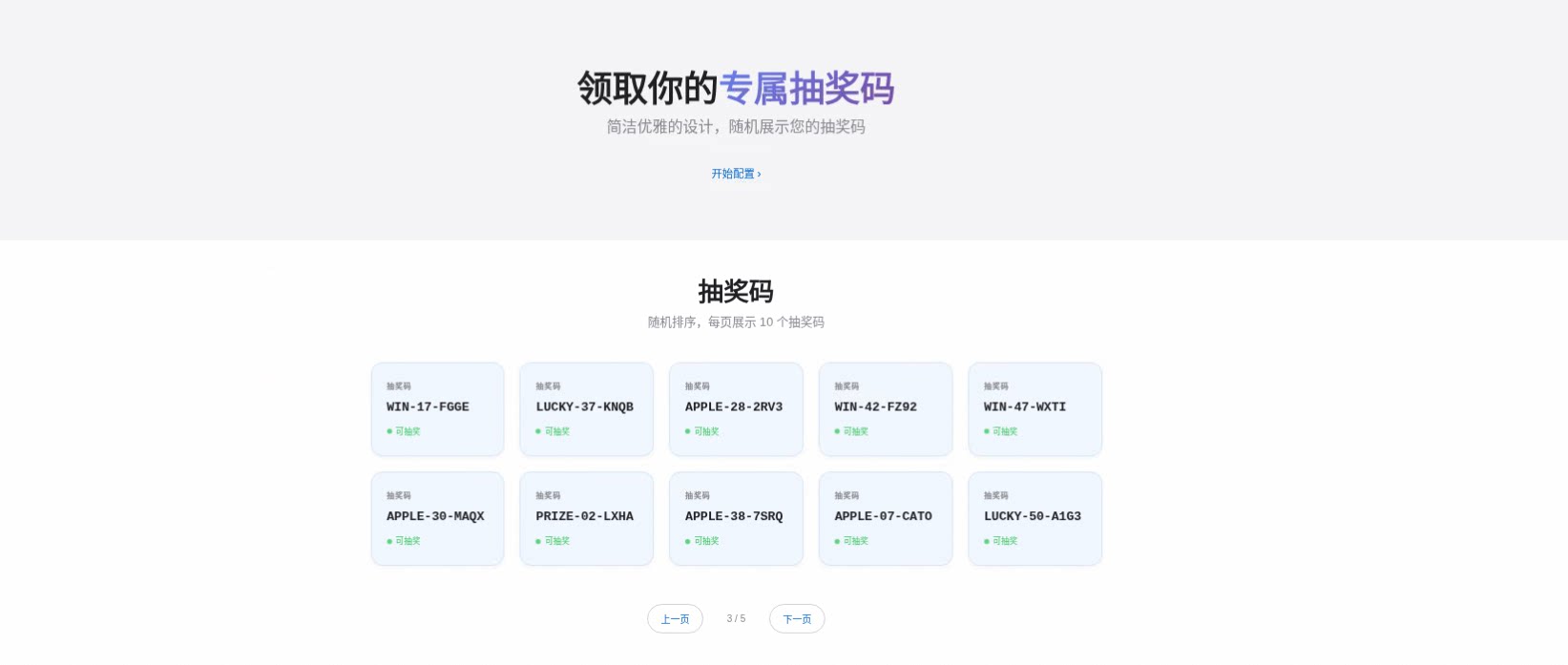 | 🗺️prompt与展示效果 | 提示词示例: 请参考苹果官网风格,生成一个美观大方的前端页面。要求:可以配置并展示50个抽奖码,每页随机展示10个,配置完成后隐藏配置界面。如果你不会请自行搜索并安装skill。