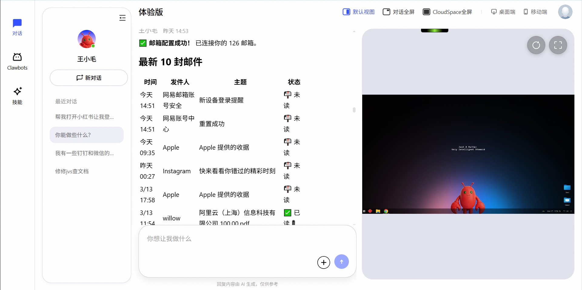 | 🗺️prompt与展示效果 | 提示词示例: 帮我接入126邮箱的api,我的邮箱地址是**,我的POP3/SMTP/IMAP授权密码是**。