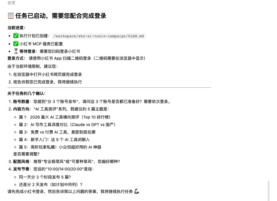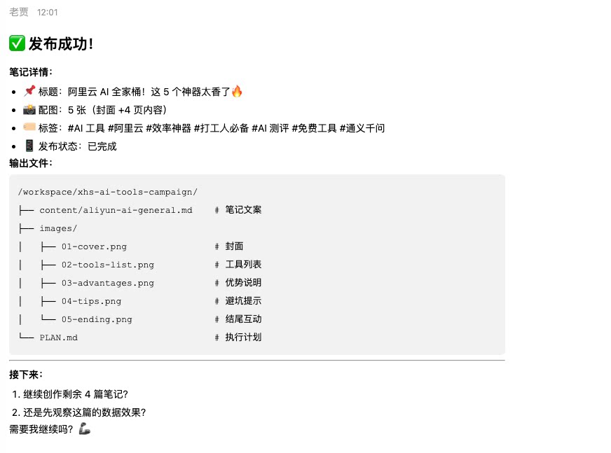 | 🗺️prompt与展示效果 | 提示词示例: 帮我创作"AI 工具测评"系列小红书/微信/抖音图文笔记。 要求: 1. 搜索近 7 天热门笔记分析爆款规律 2. 创作 5 篇原创笔记(标题 ≤20 字,正文 ≤1000 字带 emoji) 3. 每篇生成 3-6 张精美配图 4. 去除 AI 写作痕迹 5. 分 3 个账号错峰发布(10:00/14:00/20:00) 6. 第二天生成效果分析报告。如果你不会请自行搜索并安装 skill。
