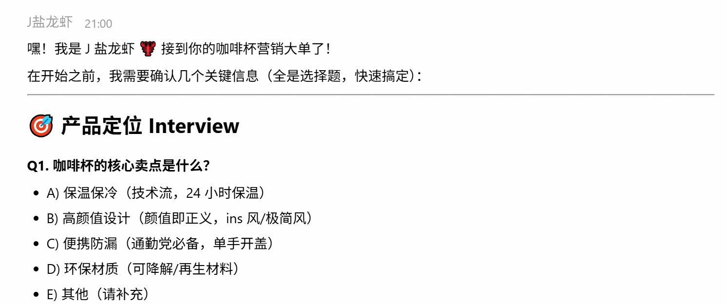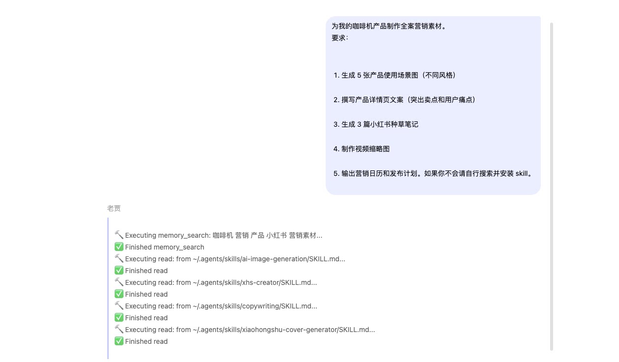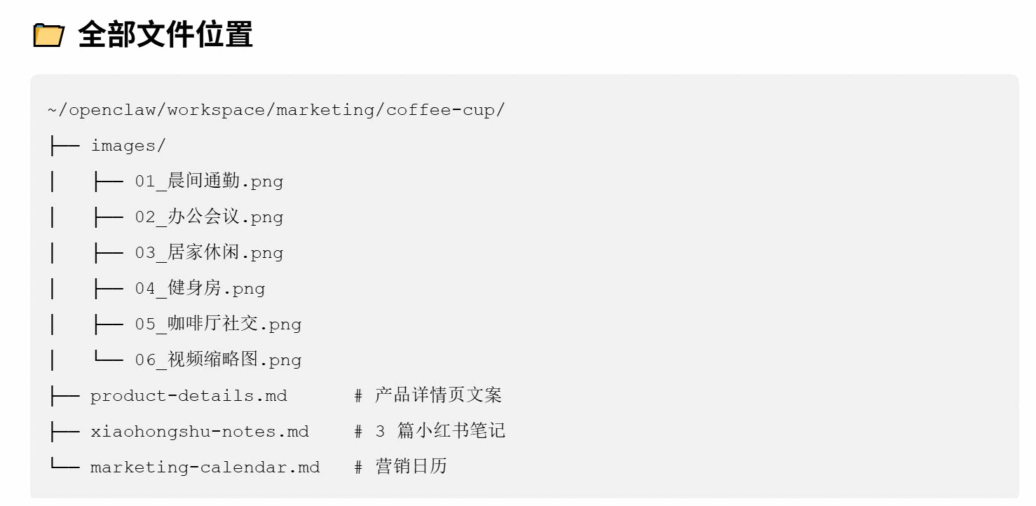 | 🗺️prompt与展示效果 | 提示词示例: 为我的咖啡杯产品制作全案营销素材。 要求: 1. 生成 5 张产品使用场景图(不同风格) 2. 撰写产品详情页文案(突出卖点和用户痛点) 3. 生成 3 篇小红书种草笔记 4. 制作视频缩略图 5. 输出营销日历和发布计划。如果你不会请自行搜索并安装 skill。