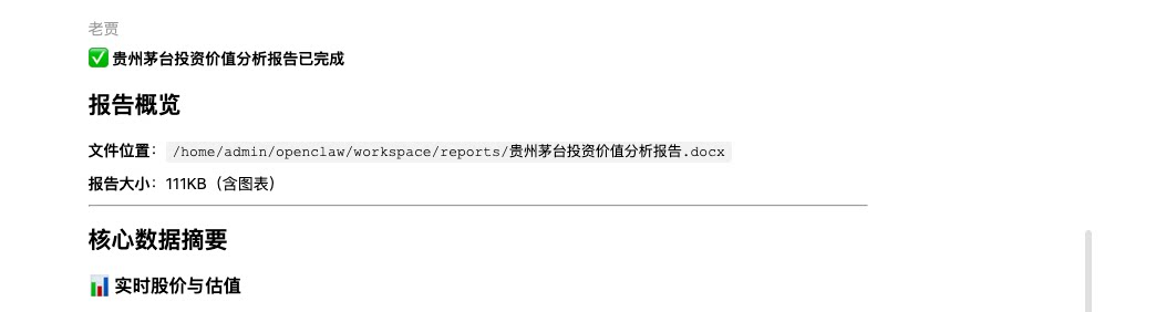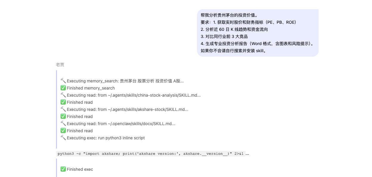 | 🗺️prompt与展示效果 | 提示词示例: 帮我分析贵州茅台的投资价值。 要求: 1. 获取实时股价和财务指标(PE、PB、ROE) 2. 分析近 60 日 K 线趋势和资金流向 3. 对比同行业前 3 大竞品 4. 生成专业投资分析报告(Word 格式,含图表和风险提示)。 如果你不会请自行搜索并安装 skill。 |