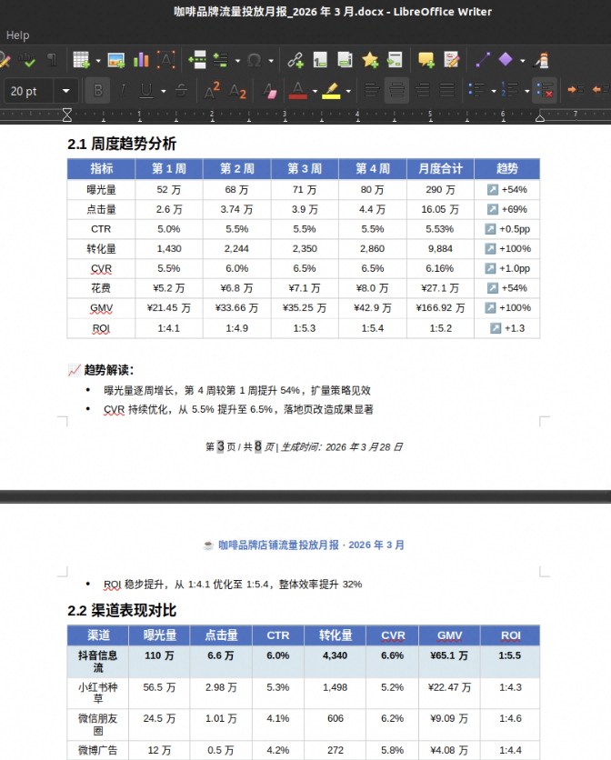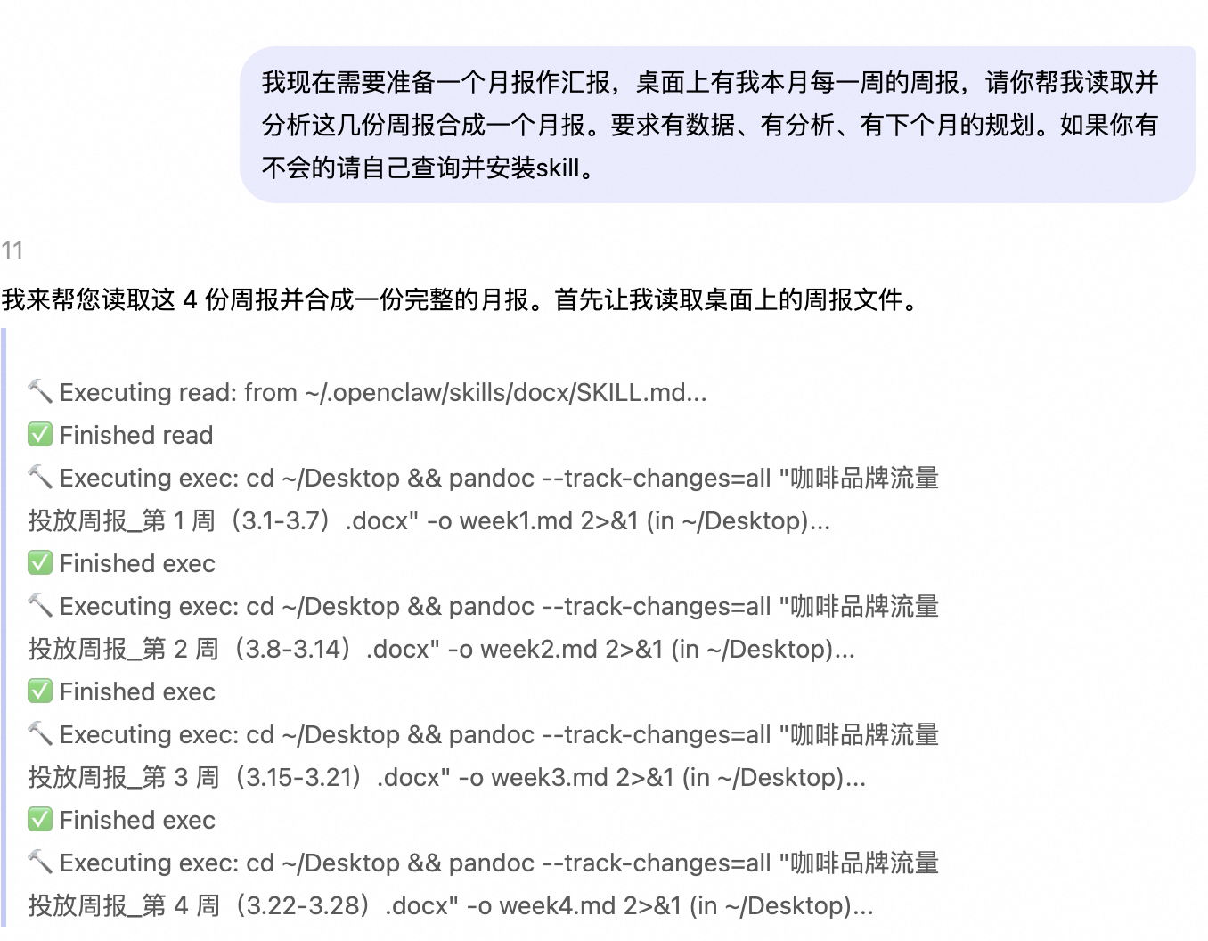 | 🗺️prompt与展示效果 | 提示词示例: 我现在需要准备一个月报来汇报,桌面上有我本月每一周的周报,请你帮我读取并分析这几份周报合成一个月报。要求有数据、有分析、有下个月的规划。如果你有不会的请自己查询并安装skill。如果你不会请自行搜索并安装 skill。