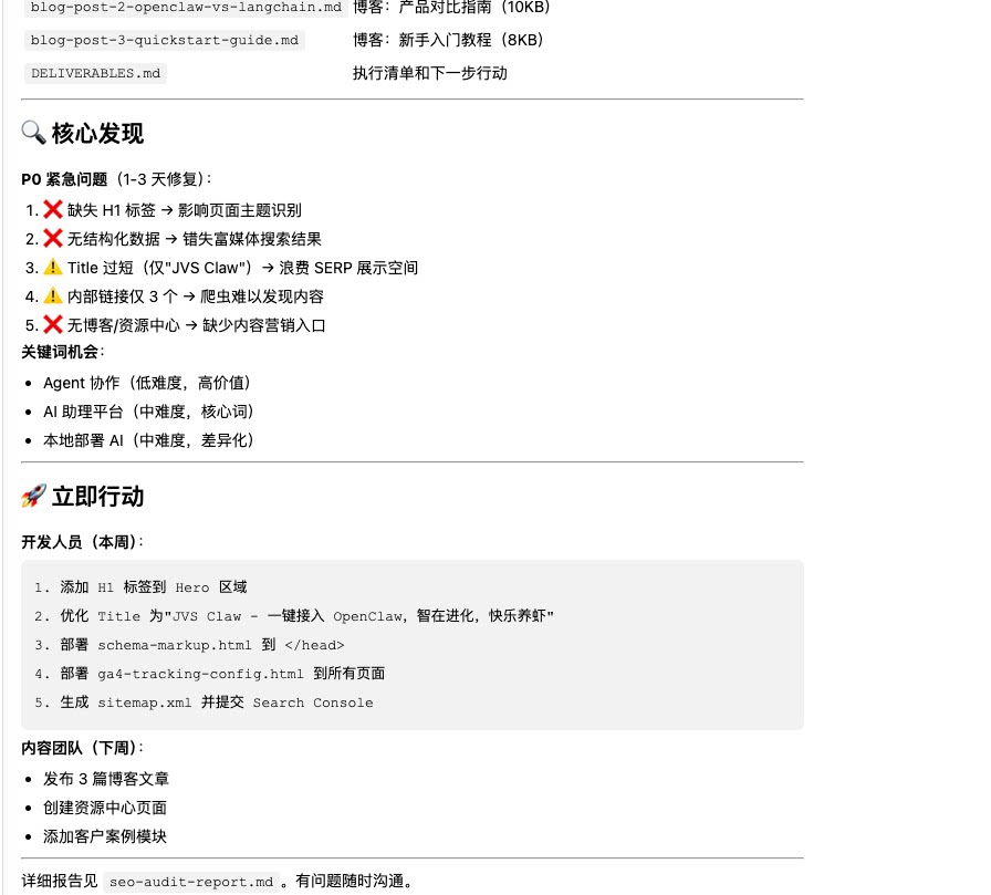 | 💻适用场景 | 网站流量下降诊断、SEO 优化、内容策略制定,无需 SEO 专家/技术人员,自动完成审计 - 优化 - 追踪 |