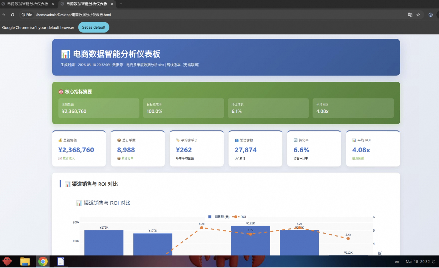 | 🗺️prompt与展示效果 | 提示词示例: 帮我分析我放在桌面的 Excel 电商数据文件。 要求: 1. 自动诊断数据质量(缺失值、异常值) 2. 清洗并标准化数据格式 3. 生成 6 种分析图表(销售走势渠道对比、转化漏斗、KPI达成率、品类分布等) 4. 计算关键指标(增长率、完成率、环比、同比) 5. 生成 HTML 交互式仪表板 6. 输出 Word 分析报告(含执行摘要和改进建议)。 如果你不会请自行搜索并安装 skill。
